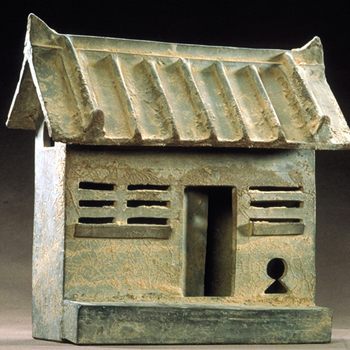 This is a ceramic model of a house, made as a burial object (mingqi) during the Eastern Han Dynasty. Models like this one were made to represent everything from simple goat or pig pens to the most elaborate towers and palaces.